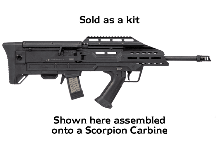 The ideal candidate for conversion is the Scorpion Carbine, and the bullpup chassis ties into our standard Carbine handguard as well as Manticore and HB Industries handguards as well. With the addition of one of those handguards, Scorpion pistols can be converted as well, though doing so with a barrel length less than 16” will require proper paperwork/tax stamp and conversion of the pistol to an SBR.