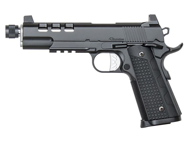 With suppressors becoming more and more mainstream, the Discretion’s match-grade stainless barrel is extended and threaded to make it a ready host. Its aggressively-ported slide, serrated trigger and competition-inspired hammer give it a look all of its own, making it stand out in Dan Wesson’s line of 1911s. High tritium sights allow for sighting over the top of most pistol suppressors, with a rear designed so that the slide can be racked on a belt if using the pistol one-handed.