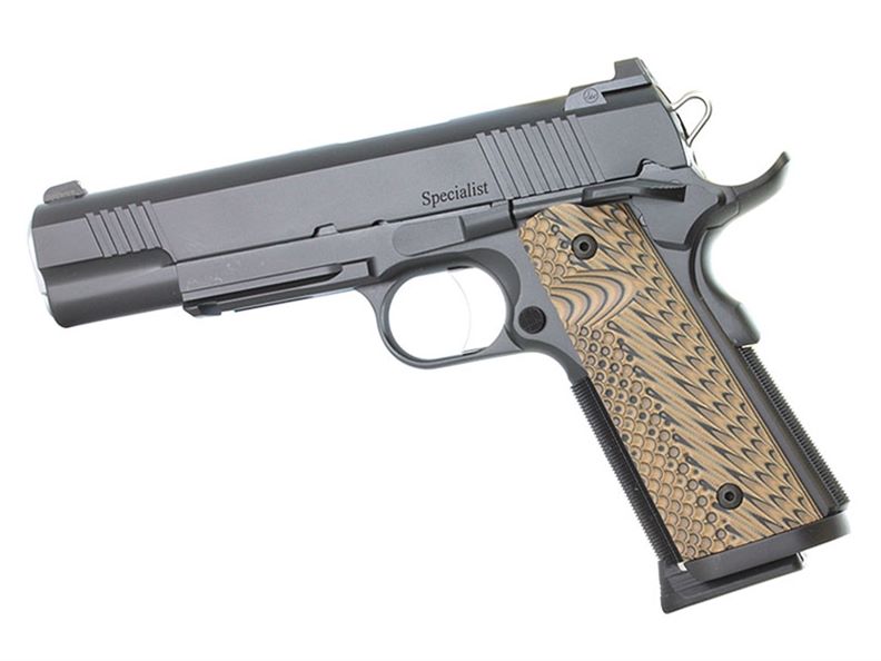 The frame sports an integral 1913 Picatinny, 25 LPI front strap checkering, undercut trigger guard and recessed slide stop to enable the installation of laser grips. Equipped with an ambidextrous thumb safety, extended magazine release and detachable two-piece magwell, the Specialist is operator-friendly. It is finished off with a set of G10 grips that force the hand into the beavertail and hold it there.