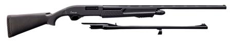 Pointer 12 gauge Standard field shotgun has a sythetic finish. The top of the reveiver is milled with 3/8 inch dovetail for accessory sights. The barrel is nickel chrome moly lined proofed for steel shot and has a fiber optic bead. It is a pump operated cycling system with magazine cut off for single round loading.