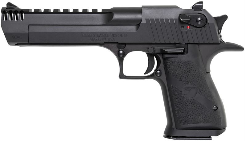 The Mark XIX Desert Eagle .50 A.E. is a gas-operated, semi-automatic pistol with a 7 round capacity.. The gun measures 10.75” in length with a 6” barrel. Width is 1.25”, height 6.25” and the weight with an empty magazine is approximately 70 ounces. It has a trigger reach of 2.75” and a sight radius of 8.5” with the 6” barrel. The construction of the Mark XIX Desert Eagle utilizes the latest CNC machine technology providing exacting specifications with tight tolerances creating a work of art in a precision firearm. The grip is anatomically formed and provides an ideal hand seating angle for two-handed shooting allowing for comfortable, rapid and accurate firing. The Weaver style accessory rail easily allows for aftermarket optics and scope rings.