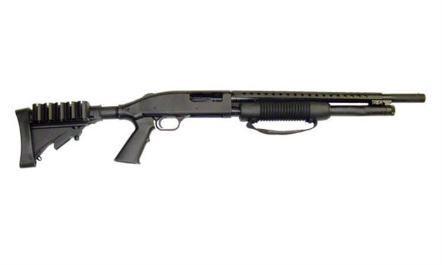 This Mossberg 500 Persuader Pump Action Shotgun features a 6 Position stock with a pistol grip, as well as a heat shield, and a highly convenient 5 shot shell carrier, which is mounted on the buttstock.