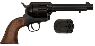 With the frame size and weight of a Single Action Army revolver, the M-1873 makes a great practice gun for Cowboy Action or an ideal carry gun for camping, hiking or fishing. The M-1873 loads from a side gate and at the half cock position just like a centerfire Peacemake, but is chambered for 22 LR or 22 magnum rounds. The hammer is made to traditional SAA appearance and feel. A key-operated, hammer block safety is standard on the left side of the recoil shield. It is available in 5.5 in and 7.5 in barrel lengths and also has a magnum cylinder that comes with the pistol. While they last this pistol also comes with a free Bowie Knife and a leather sheath.