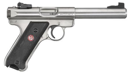 RUG Mark III .22 Long Rifle 5.5 Inch Target Barrel Stainless Steel Finish Adjustable Rear Sight 10 Round. Loaded chamber indicator. Target barrel. Fixed front and adjustable rear sights. Smoothly contoured comfortable grip features natural pointing grip angle with checkered grip panels. Manual safety and magazine release are located on the left side of the frame. Internal lock. Magazine disconnect prevents discharge when the magazine has been removed. Includes two magazines and hard plastic case.