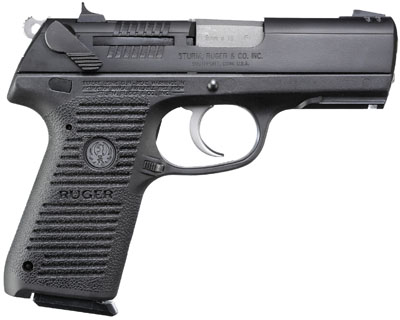 Each metal frame P95 series pistol with rail is made of hard coated A356T aircraft quality aluminum alloy; Ruger’s proprietary Terhune Anticorro stainless steel (chrome-molybdenum steel in blued models); nearly indestructible resin grip panels; custom, compounded polymer frames of the P95 andP97; and long strand fiberglass filler that is a natural shock absorber. P95 series pistols easily field strip for cleaning, without the use of special tools, into five major subassemblies. Ruger offers several ambidextrous variations on the proven P95 series double-action design. Operating features on all centerfire models include a firing pin block that prevents firing unless the trigger is completely pulled and held fully back. Manual safety models incorporate a manual ambidextrous lever that, when engaged, prevents firing unless the lever is in the “fire” position. Decock only models allow safe return to their “at rest” mode when either ambidextrous decocking lever is depressed.