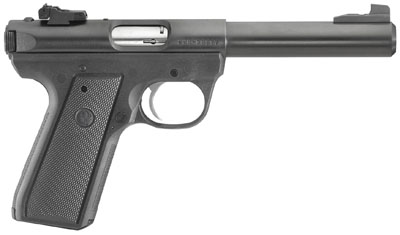 No other .22 LR pistol provides the feel of the classic 1911 pistol with the proven reliability and value of the Ruger Mark III pistols. The perfect trainer, it allows for low-cost practice and provides shooters with the familiar and preferred grip shape and feel of the famous 1911 .45 caliber pistol. In addition to the identical grip angles, the 22/45 features the same fire control locations (manual safeties, magazine releases and bolt hold-opens) as the 1911, making them perfect for .45 caliber shooters looking for an affordable way to train. This Bull Barrel model features the standard high-strength, Zytel Polymer frame, a blued finish and fixed front sight and adjustable rear sight.
