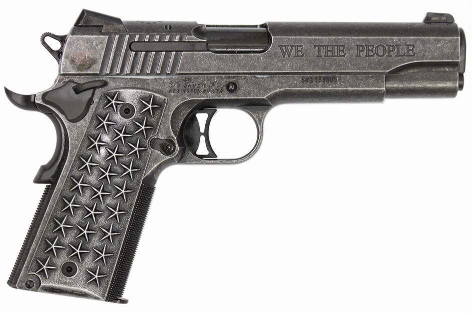 “Live Free or Die” with this special edition “We The People” Sig Sauer 1911 pistol. Sig Sauer’s brand new “We The People” pistol features a “Distressed” finish on the frame & slide, Raised Star Grips, and 13 stars engraved on the top rear of the slide.