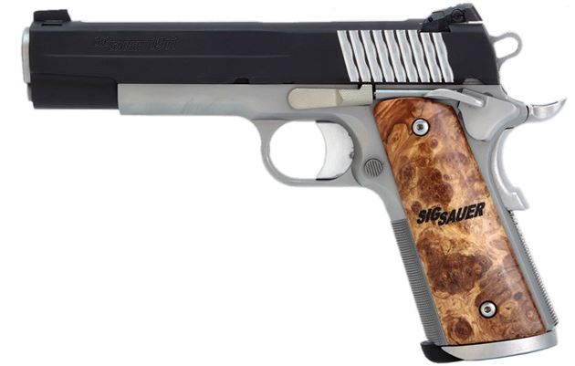 The 1911 STX from the SIG SAUER Custom Shop is a two-tone 1911 that’s loaded with features. This non-railed pistol features a Nitron® slide over a natural Stainless frame and is accented by beautiful custom wood grips. The slide is further accented by polished cocking serrations and a flat-top which enhances the two-tone aspect of this pistol. The slide is topped off with adjustable combat night sights while the frame is outfitted with a magwell for fast smooth reloads.