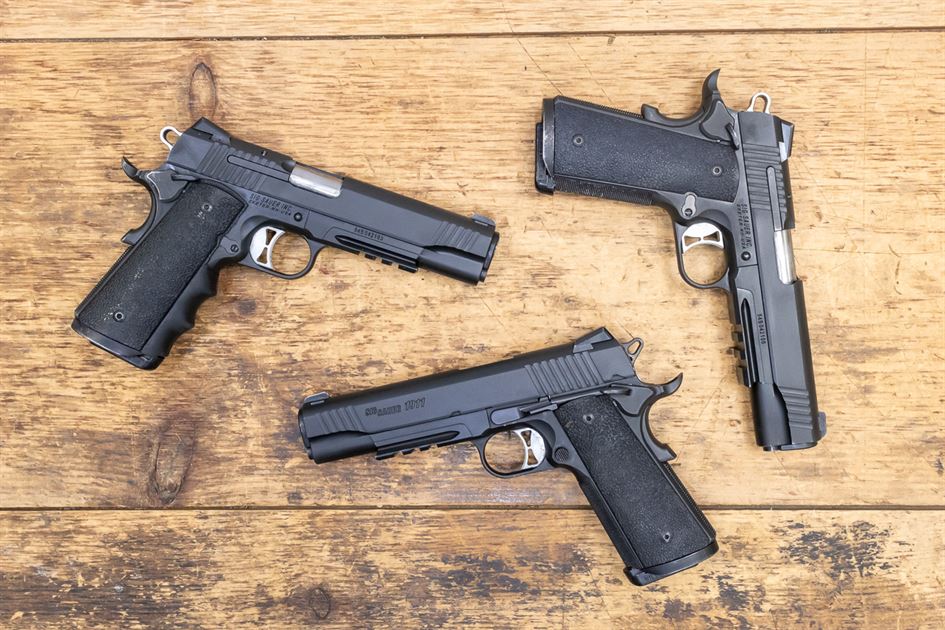 These photos represent the exact firearms for sale, all of which are in good condition. This Sig Sauer 1911 Tacops 45 ACP Pistol comes with two 8-round magazines.