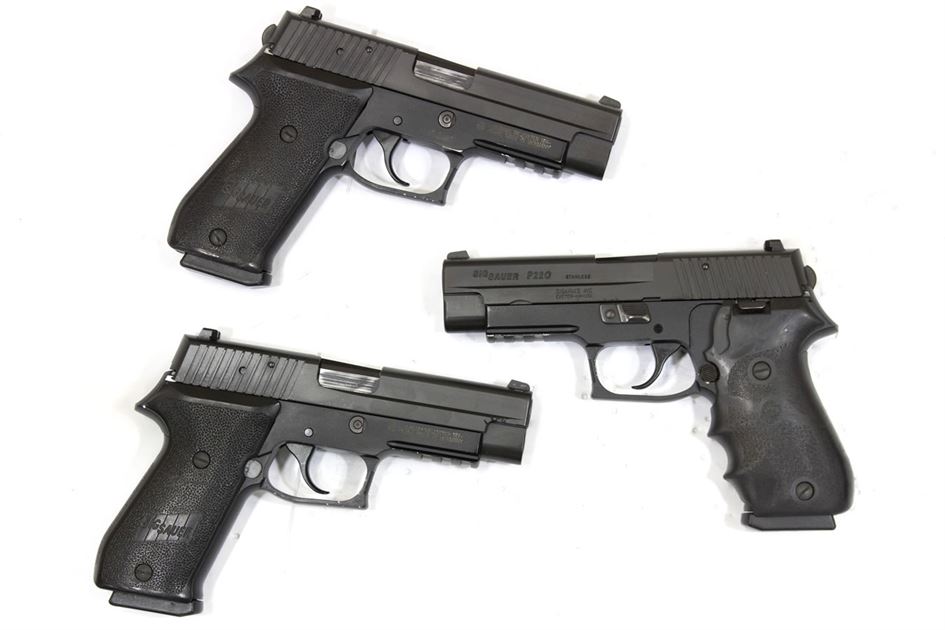 The photo represents the overall condition of these Sig Sauer P220R DAK police trades, all of which are in fair condition.