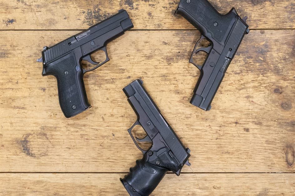 The photo represents the overall condition of these Sig Sauer P226 police trades, all of which are in good condition.
