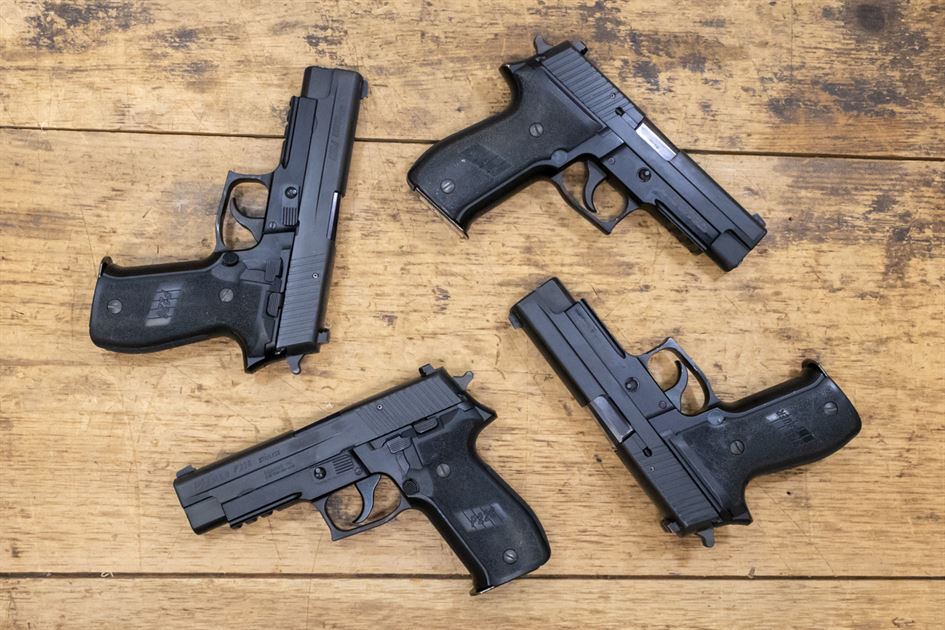 The photo represents the overall condition of these Sig Sauer P226 police trades, all of which are in good condition.