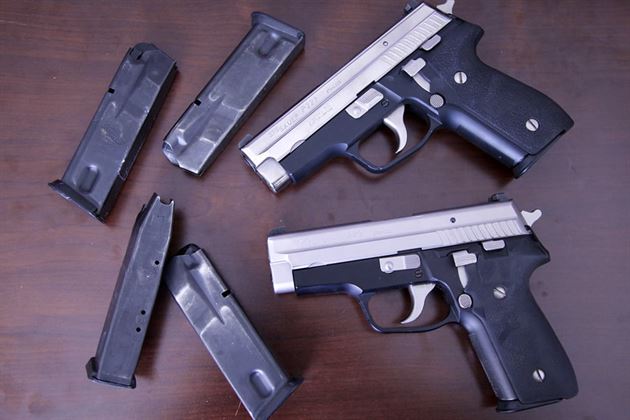 The photos represent the overall condition of these Sig Sauer P229 Stainless police trades, which are in good condition. Each pistol comes with three 12-round magazines.