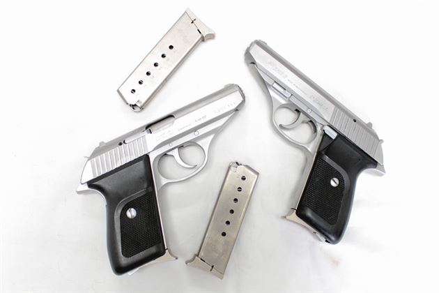 The photos represent the overall condition of these Sig Sauer P230 380 caliber police trades, which are in fair condition. Each pistol comes with two 7-round magazines.