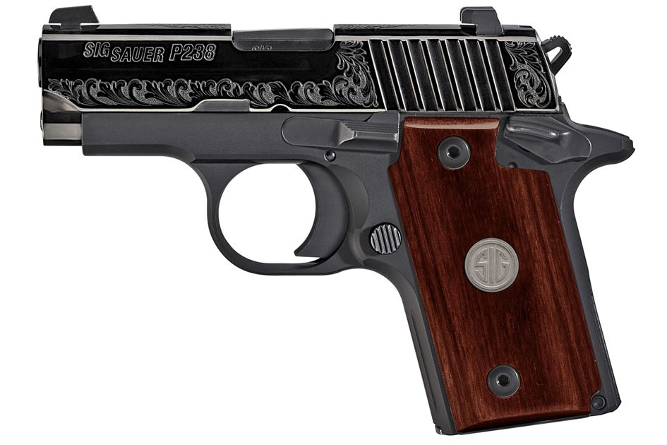 The P238 ESR model features a polished Nitron® engraved slide with SIGLITE night sights, black hard coat anodized frame and rosewood grips with SIG medallion.