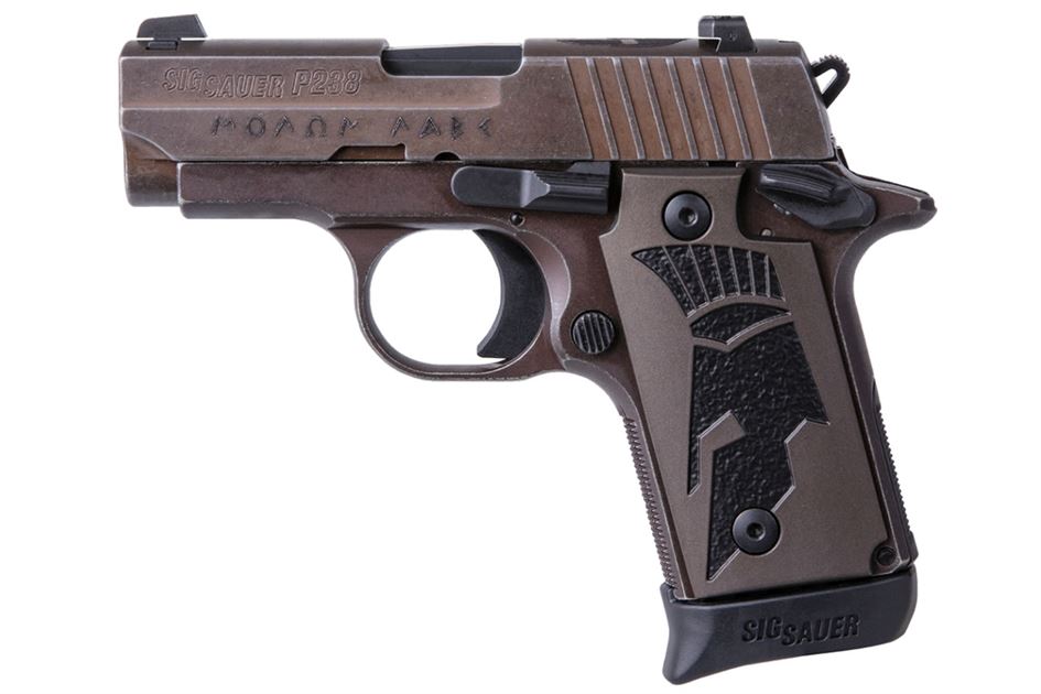 The Spartan II series of pistols are all hammer-fired, single-action-only, all-metal pistols in a distressed coyote finish with custom engraved aluminum grips featuring the SIG SAUER Spartan branding, an engraved emblazoned slide with the Spartan helmet and the classical expression “Molon Labe”, and SIGLITE Night Sights.