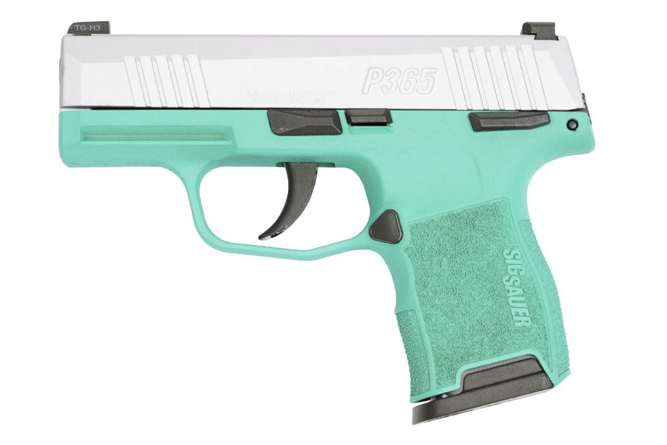 This exclusive Sig Sauer P365 features a Robins Egg Blue Cerakote frame and a Sliver Cerakote slide.