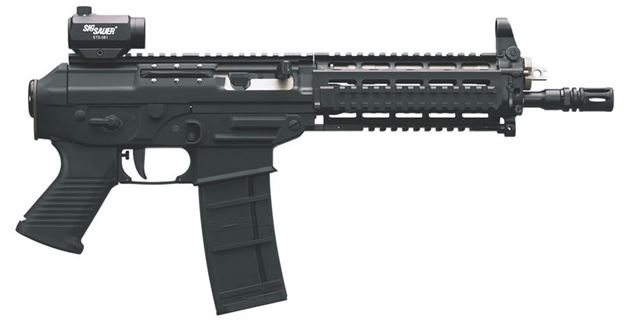 The Picatinny rail features a SIG SAUER® Mini Red Dot sight that works in concert with the optional hooded front sight. The trigger housing is machined from an aircraft grade aluminum alloy forging with a hard-coat anodized finish designed to survive extreme conditions. The P556 SWAT features a aircraft aluminum quad-rail designed for mounting accessories. The P556 SWAT also comes equipped with a smooth two-stage trigger, ambidextrous safety and is designed to accept standard AR magazines. The pistol ships standard with (1) 30-round magazine. The P556 SWAT is compatible with M16/AR-15 type magazines.