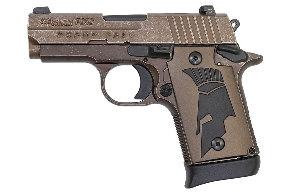The P938 Spartan II is all stainless steel in a distressed coyote finish. The slide is engraved with the Greek phrase “MOLON LABE” (“Come and take them”) while the custom grips feature the inlaid Spartan helmet. It’s just a fraction of the size of our full-size pistols. A smart looking, small handgun built with the same accuracy and reliability as large frame SIG SAUER pistols. The magazine combines a 7-round magazine tube with finger groove, providing additional control and increased capacity.