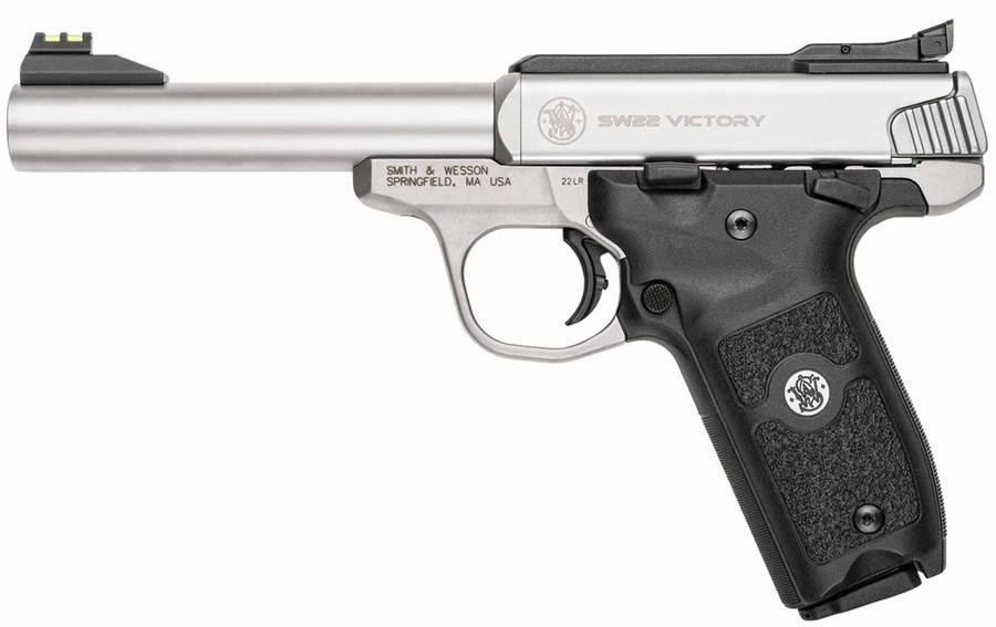 The standard model is fitted with a 5.5-inch match-grade barrel with a 1 in 15-inch, six groove, right hand twist. The SW22 Victory comes standard with a fiber optic front sight and an adjustable green fiber optic rear sight. The pistol is also standard with an alloy trigger with adjustable trigger stop. Fire controls on the pistol include a single-sided thumb safety, slide stop and magazine release.